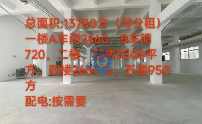 现有环评重工业厂房招租: 五金酸洗 喷粉 注塑 磷化环评 丹灶金沙 —————————————————— 厂房总面积:13780㎡ 一楼A车间:2460㎡ B车间:720㎡ 二楼 车间:3500㎡ 三楼 车间:3500㎡ 四楼 车间:2650㎡ 五楼 车间:950㎡ —————————————————— 电梯:一台5吨,一台3.2吨 超大空地,停车、拖头随意 配电:630KVA还可增容 厂房优势:大小可以分租,承重2吨,交通方便。